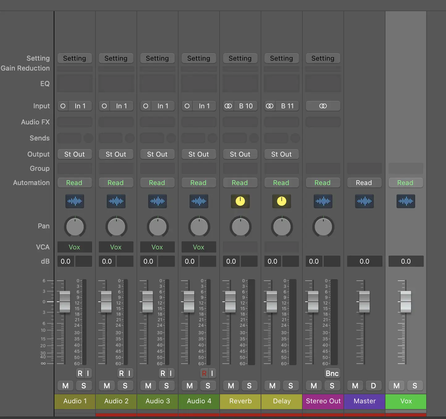 Por exemplo, digamos que tem um conjunto de faixas vocais que encaminha para um subgrupo. Em cada um dos faders do canal vocal, tem envios pós-fader para um par de reverbs e um delay.