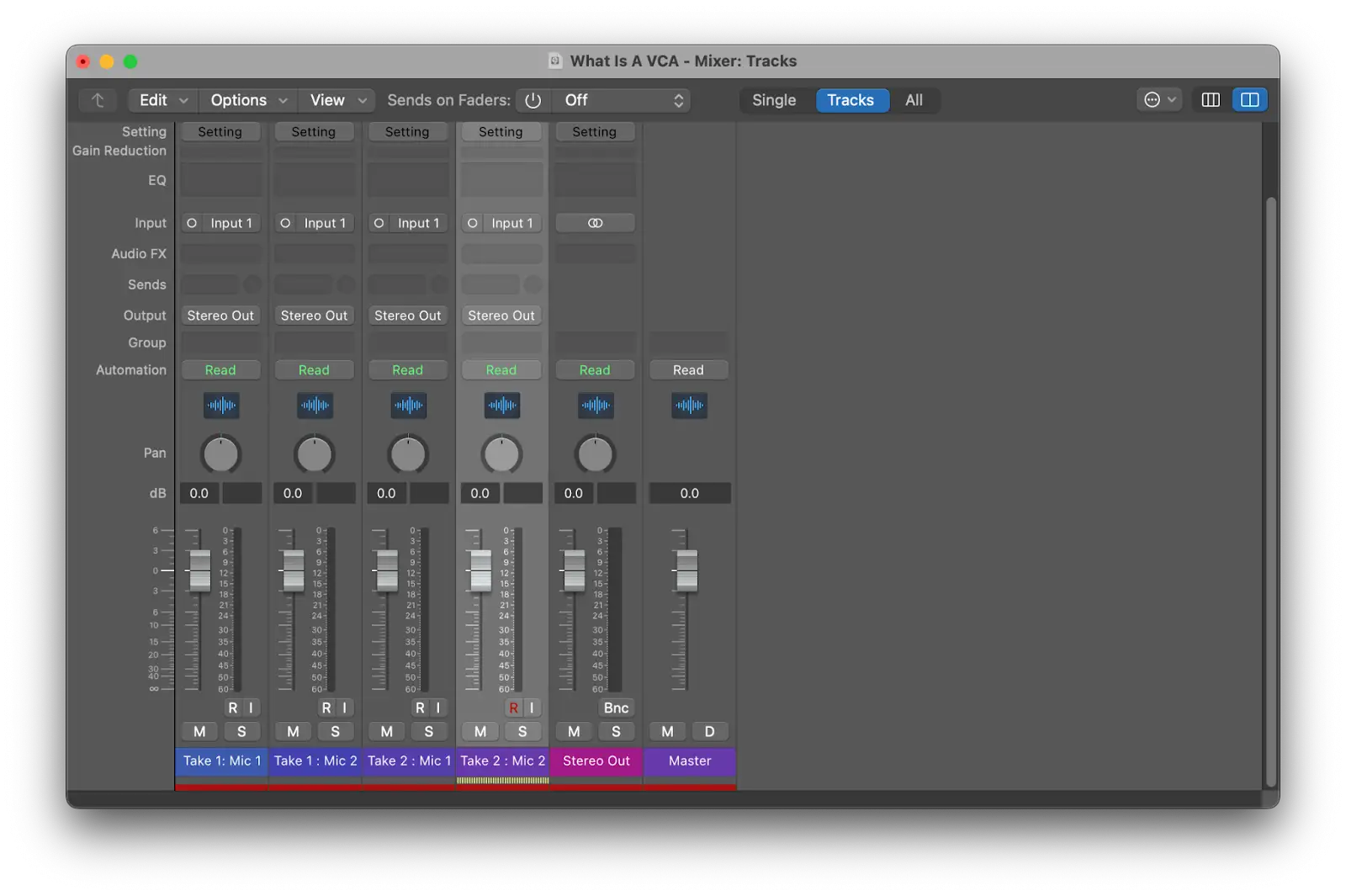 Pretendo processar cada uma das tomadas de forma ligeiramente diferente e efetuar uma panorâmica das mesmas. Para isso, vou usar subgrupos. Mas também quero ajustar a mistura dos dois microfones à medida que misturo, por isso vou usar um fader mestre VCA como controlo remoto para o nível de cada microfone.