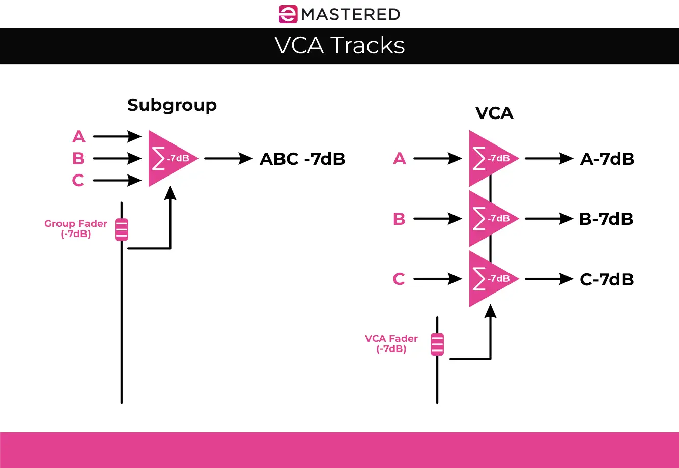 O conceito mais importante a compreender com VCAs é que, ao contrário de sub-misturas e outros grupos, nenhum áudio é passado através do canal VCA. O VCA controla o ganho dos níveis de sinal originais nos canais do grupo, incluindo a capacidade de silenciar e soltar a saída.