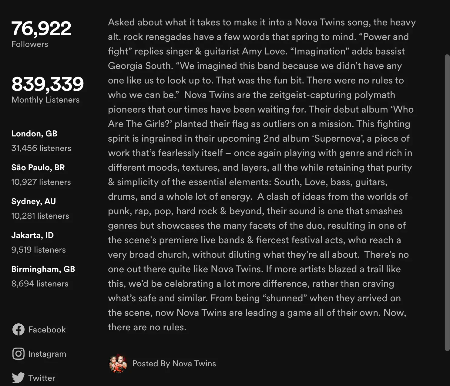 As redes sociais têm visivelmente menos espaço do que outros meios para biografias de música. No entanto, algumas palavras curadas podem ajudar os novos olhos a perceber quem é e onde espera chegar como artista.