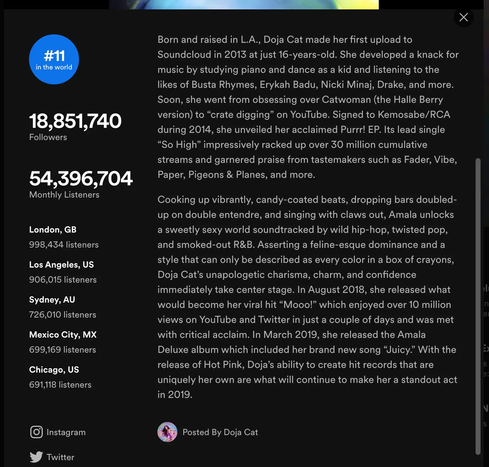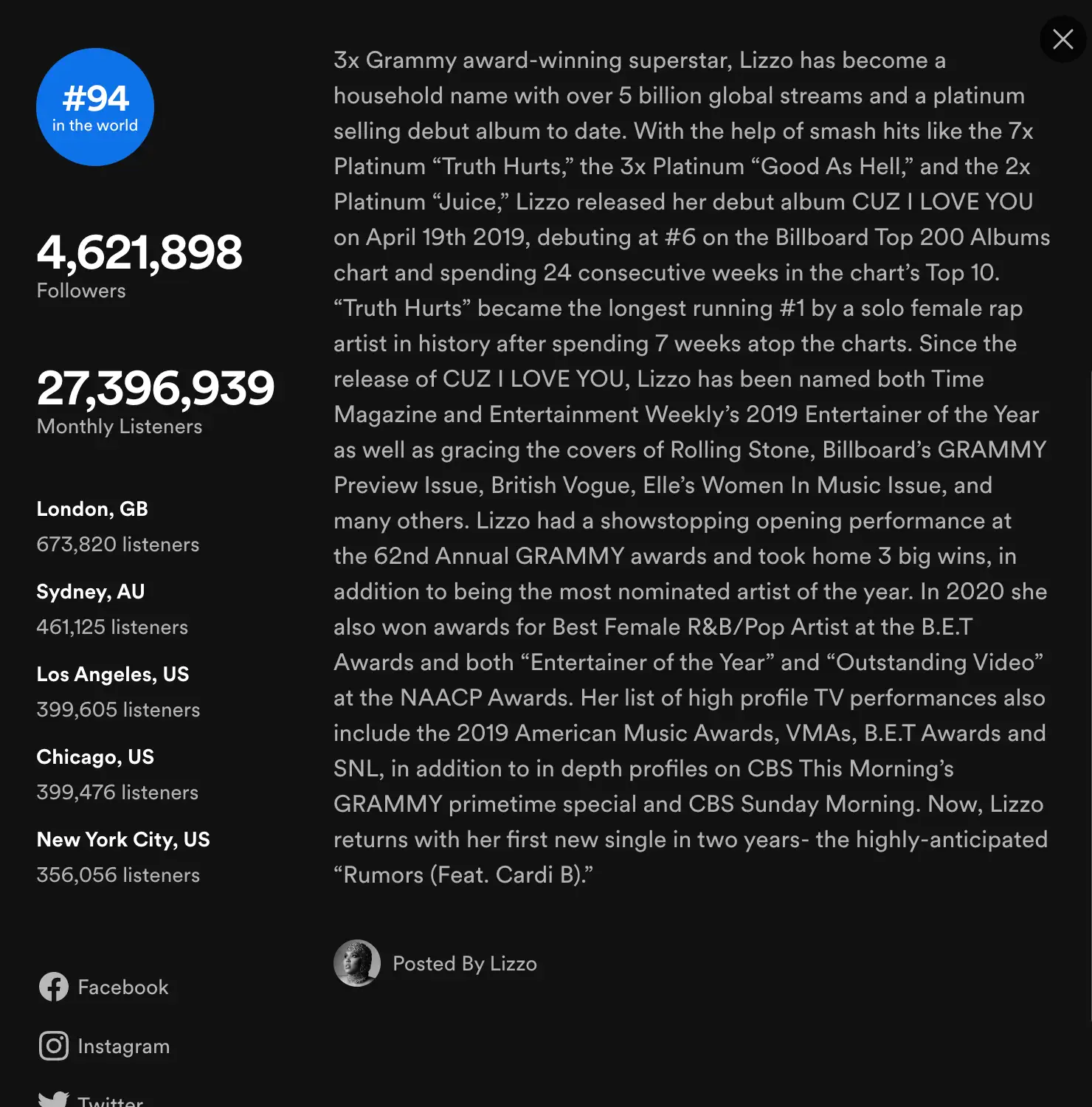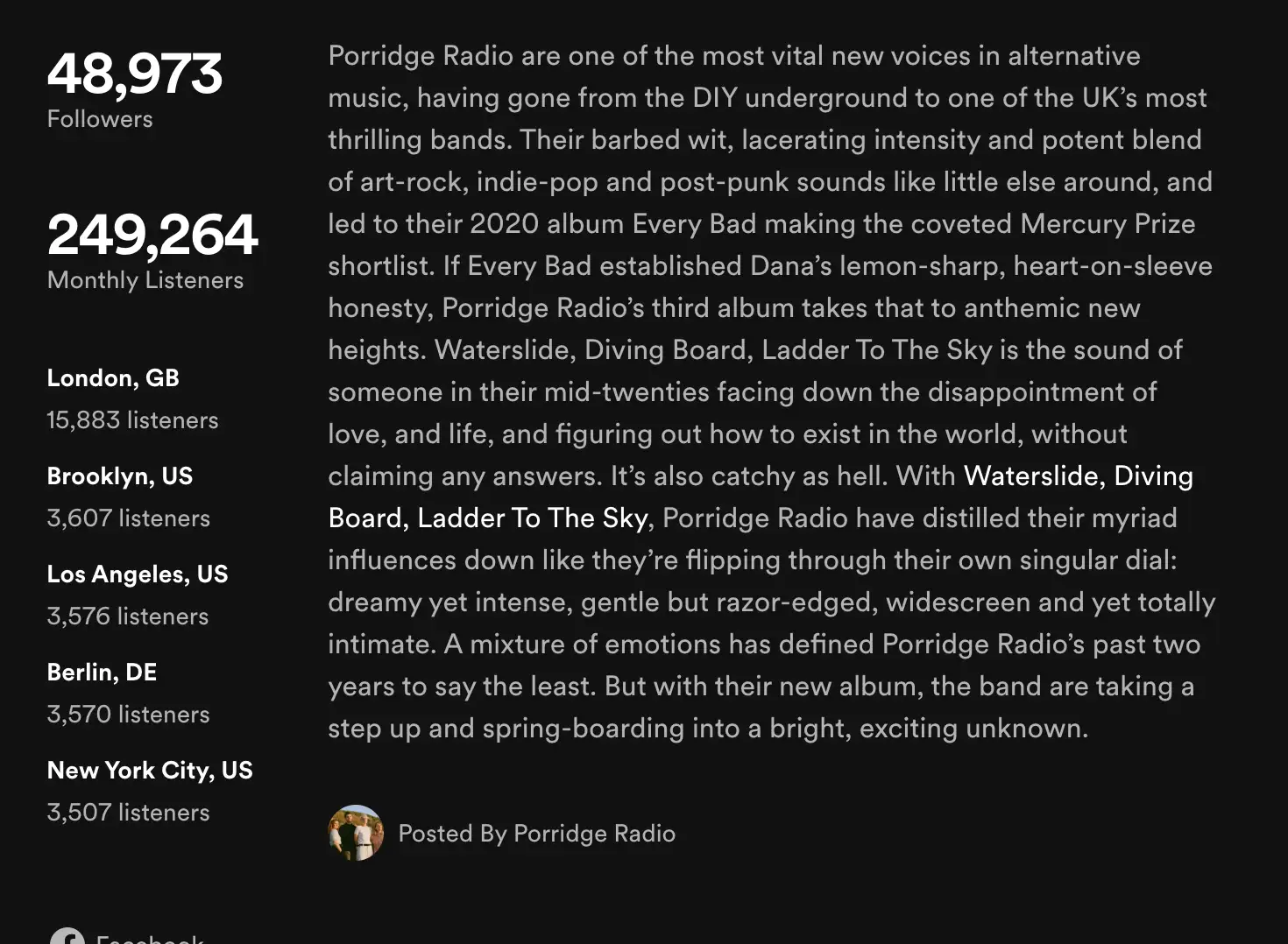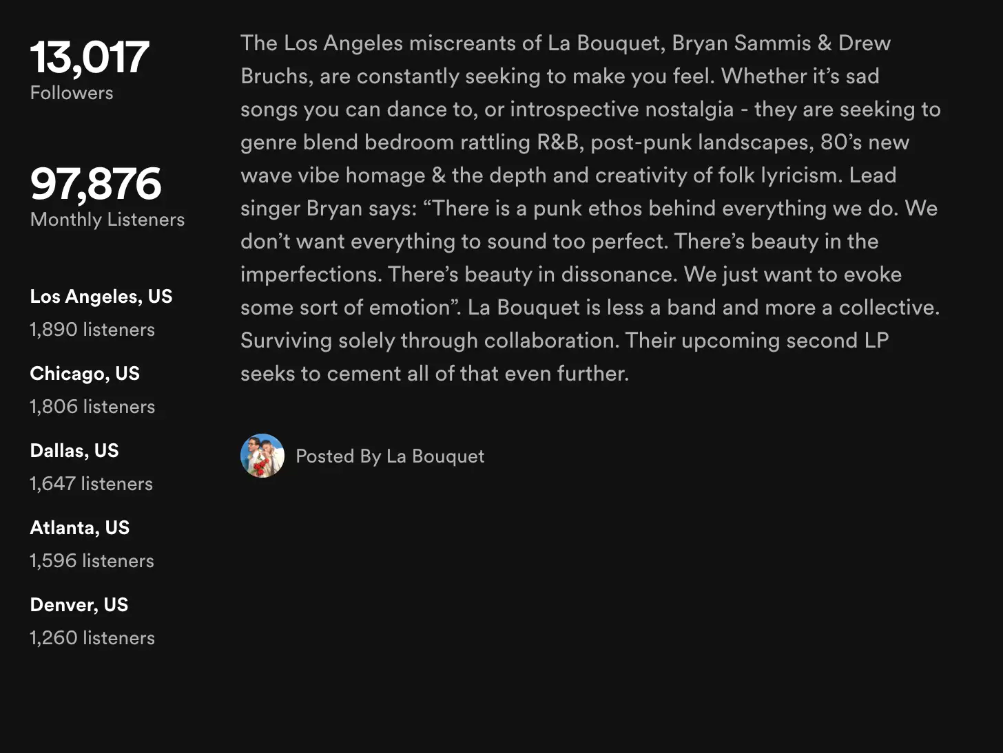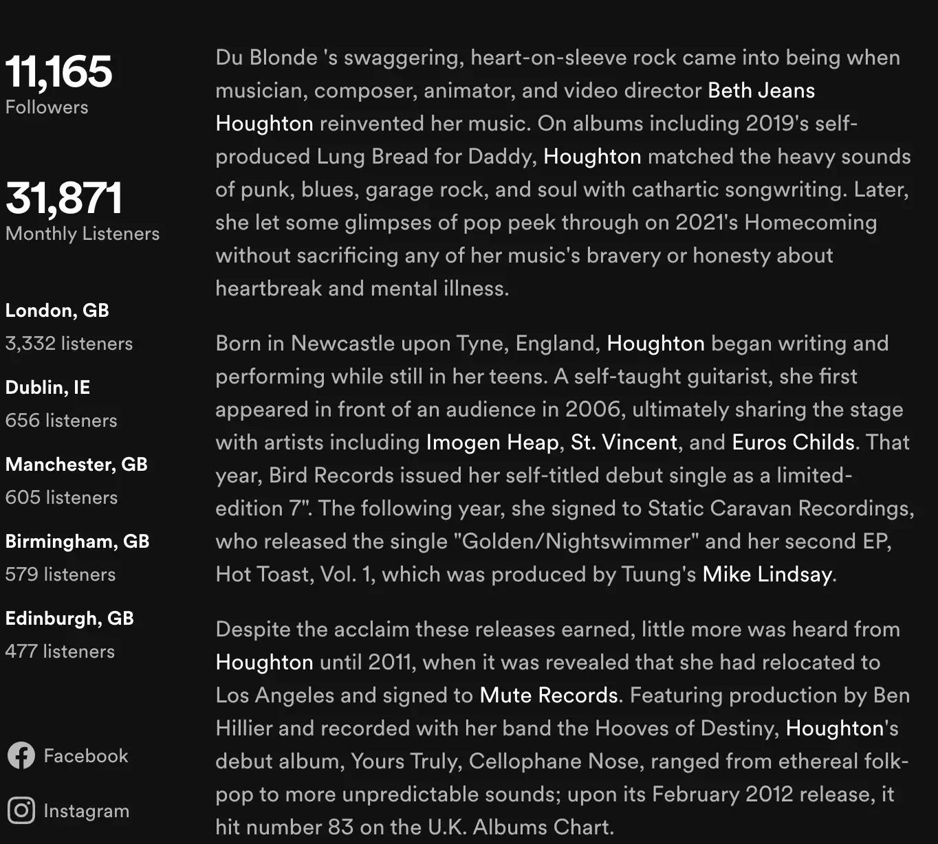 As plataformas de streaming digital ou DSPs são um dos principais locais para alojar uma biografia musical. Muitas vezes, plataformas como o Spotify servem como ferramenta de descoberta de música, e uma biografia de artista pode ajudar a converter um ouvinte passivo num fã leal enquanto o seu público está apenas a conhecê-lo. É apresentada de forma proeminente no seu perfil de artista e pode ser actualizada regularmente com base no seu calendário de lançamentos.