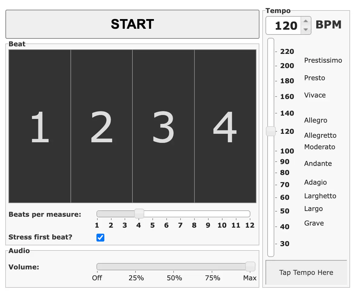 Metronomul online deține o configurație similară cu omologul său hardware. Puteți seta tempoul atingând ritmul sau selectându-l pe metronom, separat de marcajele de tempo. Metronomul online are, de asemenea, un cronometru de practică încorporat, mai multe opțiuni de sunet și câteva semnături de timp din care să alegeți.