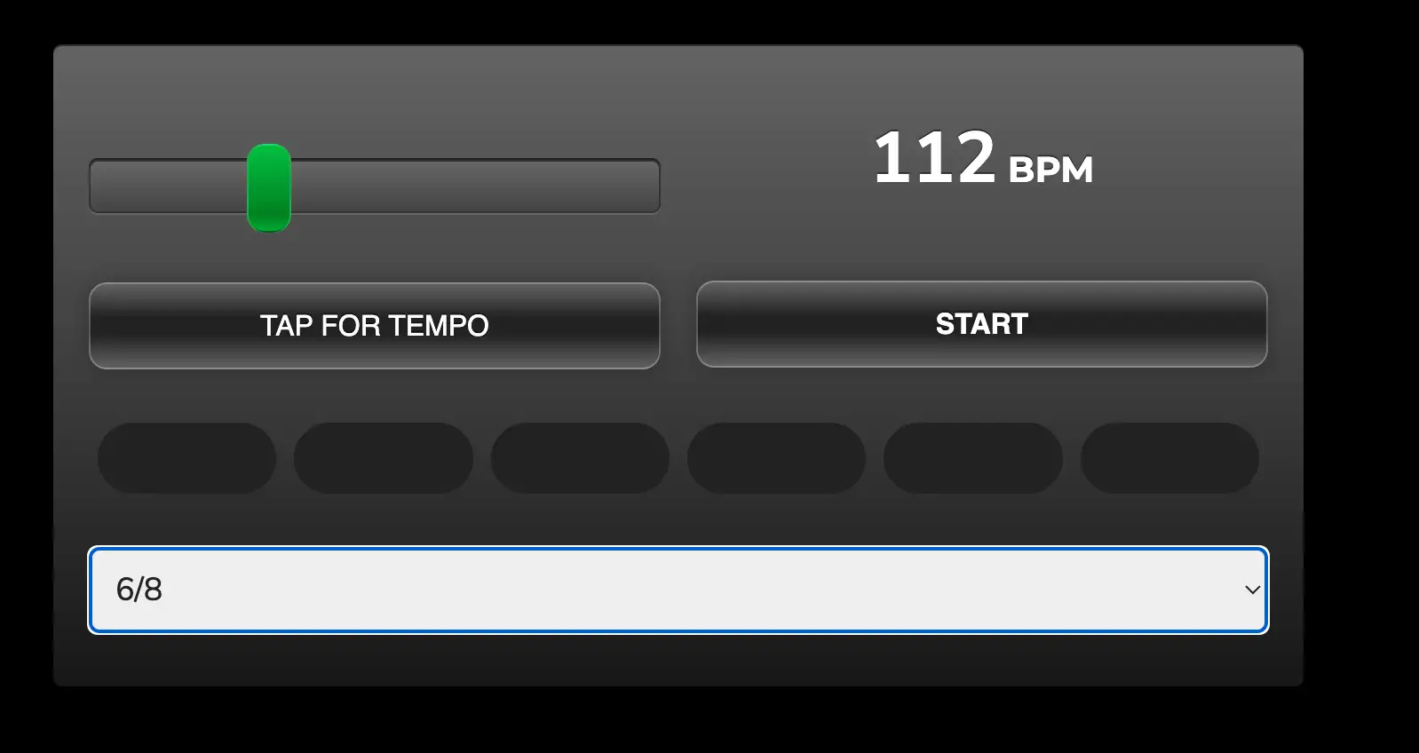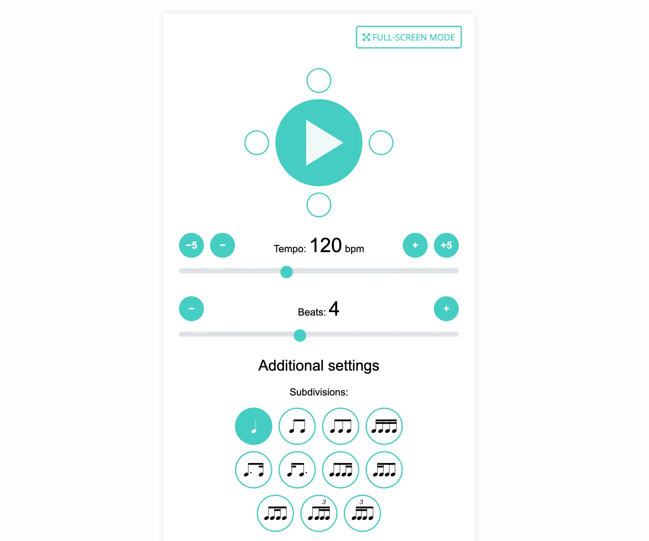 Metronomul online gratuit oferit de Violinspiration oferă o mulțime de comutatoare de subdiviziune pentru piesele mai complexe. Puteți seta tempoul, adăuga subdiviziuni nuanțate și ajusta rapid semnătura timpului. Acest metronom online gratuit oferă, de asemenea, un mod full-screen pentru o concentrare suplimentară.