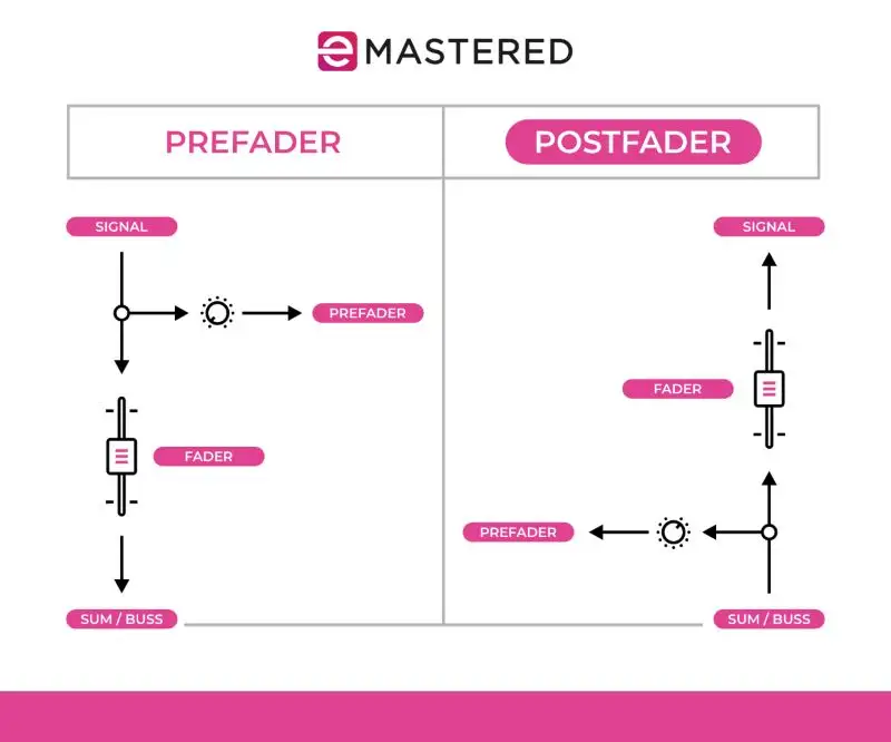 Pe scurt, pre-fader și post-fader definesc punctul din lanțul semnalului audio în care are loc procesarea audio în raport cu faderul de volum: pre-fader înseamnă înainte de faderul de canal, iar post-fader înseamnă după fader.