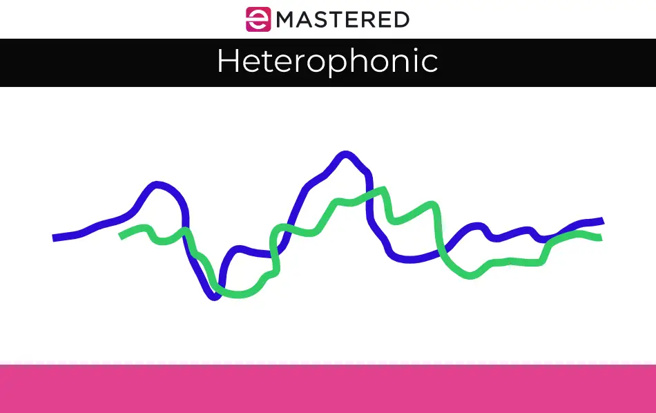 В гетерофонической музыке несколько исполнителей исполняют вариации одной мелодии. Певец в сопровождении одного горна, исполняющий одну и ту же мелодию с небольшими риффами то тут, то там, будет гетерофоническим.