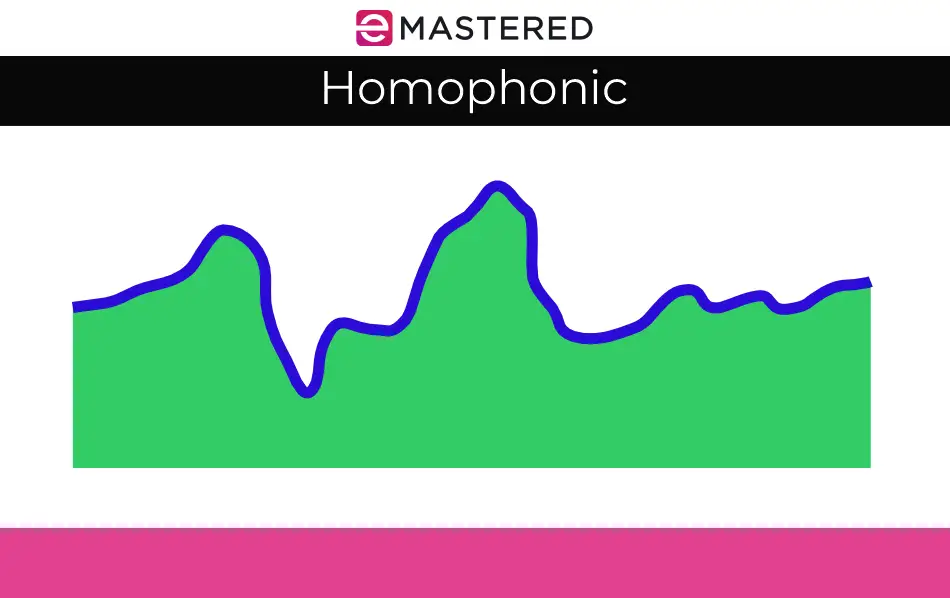 На графике ниже показано визуальное представление гомофонной фактуры. Синяя линия представляет основную музыкальную линию, а зеленая штриховка показывает гармоническую поддержку.