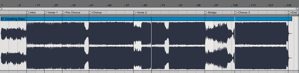 När det väl finns där spelar du upp referensspåret från början och gör markeringar i din egen DAW vid specifika punkter där arrangemanget verkar förändras. En bra strategi är att använda de termer som popmusiken använder för att beskriva sektioner: Intro, vers, prechorus, kör och brygga. EDM-spår har också drops, så du får gärna markera dessa avsnitt på ett annat sätt än körer om du vill. Bilden nedan visar hur det här ser ut när jag gör det i Ableton, med OneRepublics "Counting Stars" som exempel: