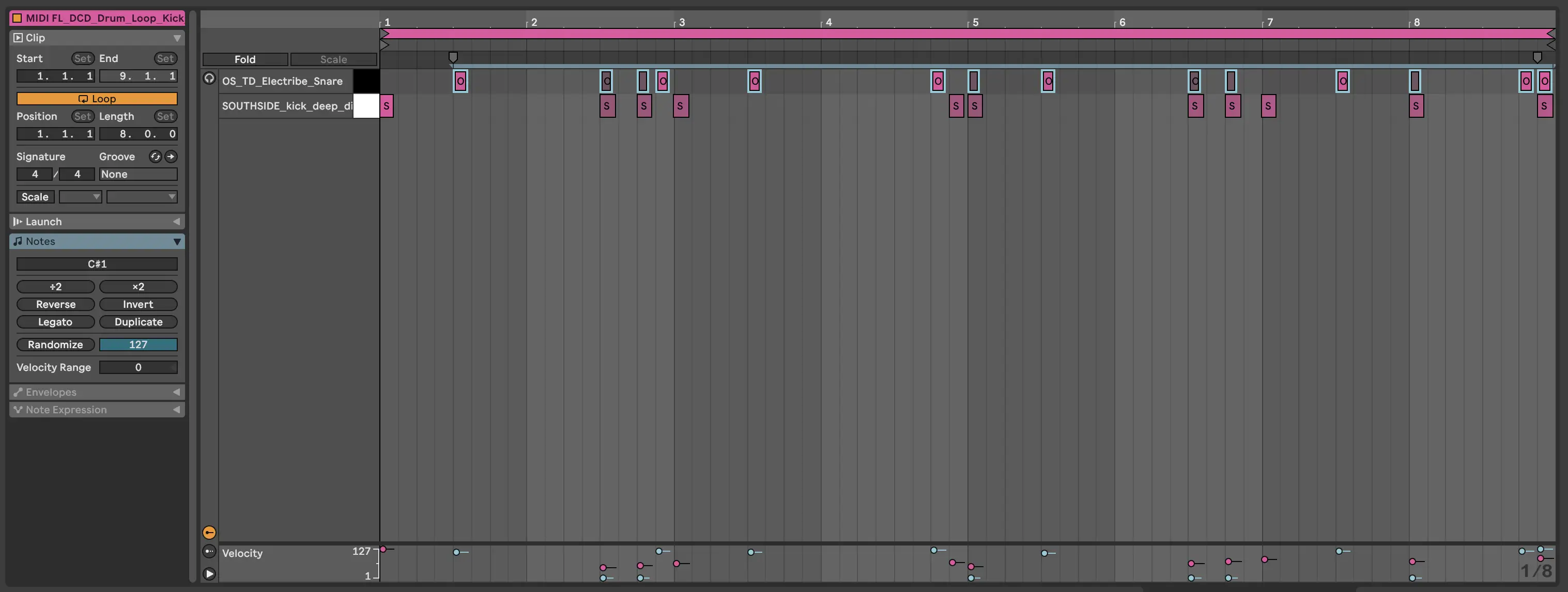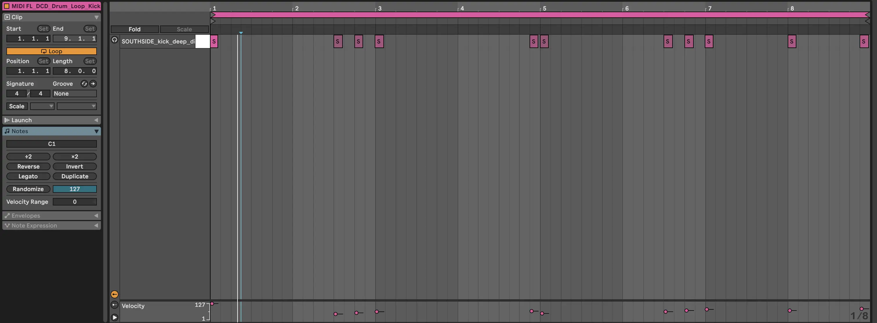 Ardından, 808 vuruşunuzu 4/4'lük çubuğunuzun ilk vuruşuna (aşağı vuruşa) yerleştirin. Buradan itibaren varyasyonlar eklemeye başlayabilir, drill'in meşhur senkoplu ritmi için tekmeleri ızgaranın dışına yerleştirebilirsiniz. 808'lerinizde slide'larla denemeler yapmak tan da korkmayın. Ableton'un pitch glide özelliğini kullanarak 808'lerinizin bir notadan diğerine kaymasını sağlayabilir ve parçanın daha organik duyulmasını sağlayabilirsiniz.