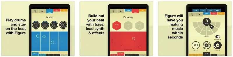 Auxy Studio 看起来很简约,然后我打开了 Reason Studios Figure。在这款 iPhone/iPad DAW 中,他们真正做到了 "去其糟粕,取其精华"。其中包含的唯一用户选项是鼓编曲器、低音合成器和主音合成器。你可以设置每种乐器的音调,然后直接开始音乐制作。你可以即时试听音序,准备就绪后,弹入录音并执行演奏。在录音时,自动模式会自动开启,因此你可以快速更改刚刚录制的合成器参数,并根据自己的音质喜好进行调整。