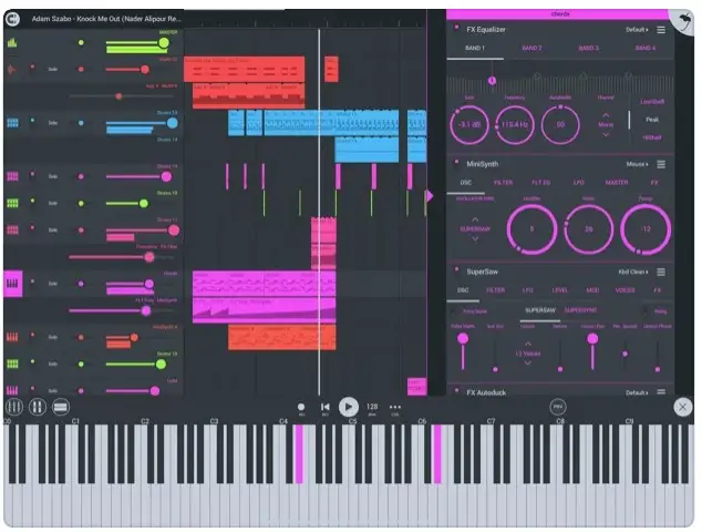 它有一个完整的混音器,配备了基于时间的处理效果,如混响、压缩、滤波器、延时、均衡器、镶边、合唱、自动平移、BitCrusher、过载、6 段参数均衡器。它还可用作便携式录音室,效果不逊于任何台式机版本。