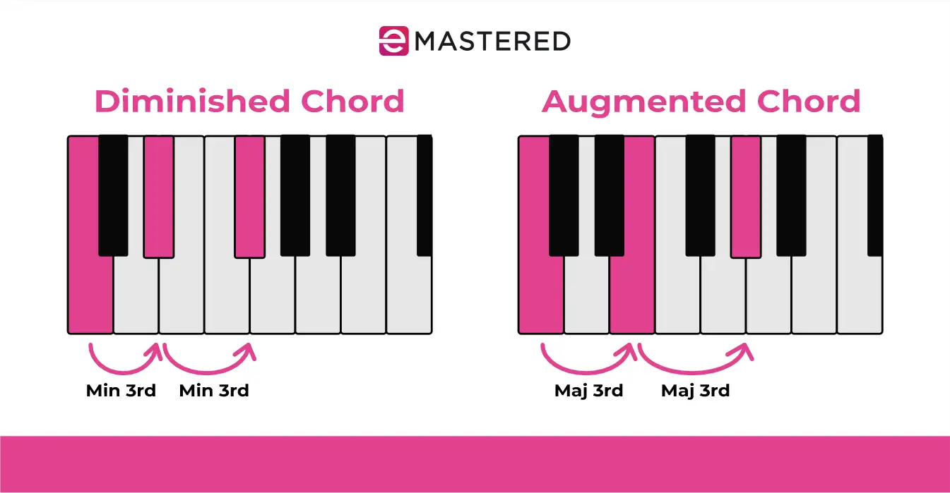 常规的增三和弦由一个根音、一个大三度和一个升五度(比根音高八个半音阶)组成。例如,C 增三和弦(C aug)包括 C、E 和 G#。