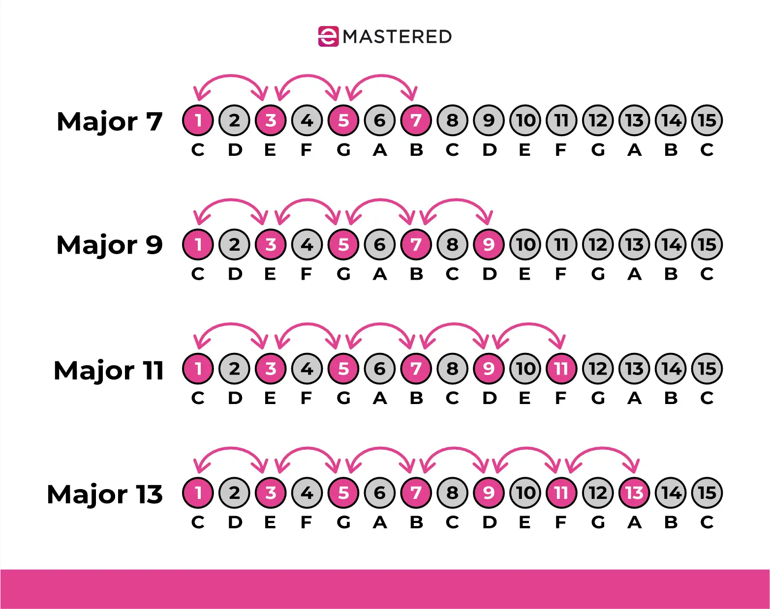 我们在 R&B 中使用它们的一个主要原因是,它们能让和声变得更有趣。例如,在演奏 Cmaj7 和弦(C-E-G-B)时,我们会在基本的 C 大三和弦上添加一个大七和弦,以创造出更饱满、更嘹亮的声音。