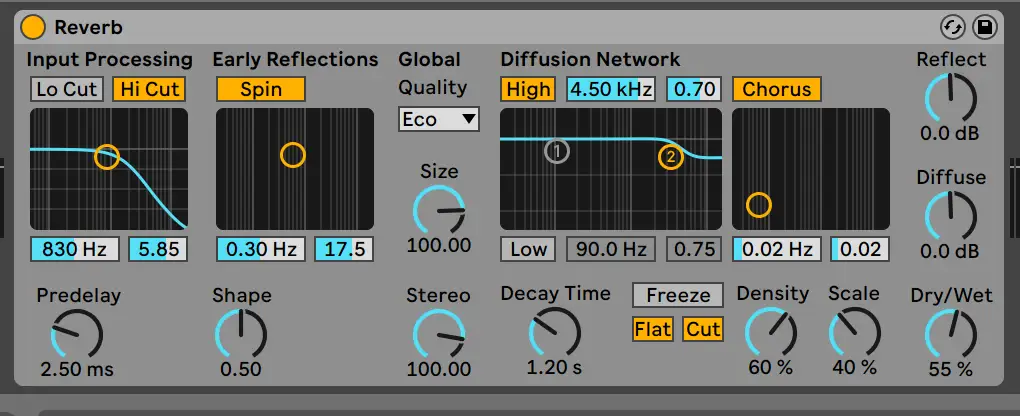 每种混响都有自己的一组控制,可用于为音频信号营造不同的音效氛围。下面是 Ableton Live 中提供的混响效果,但无论是使用 Pro Tools 还是 Logic,每种 DAW 都会提供具有类似控制功能的混响效果。